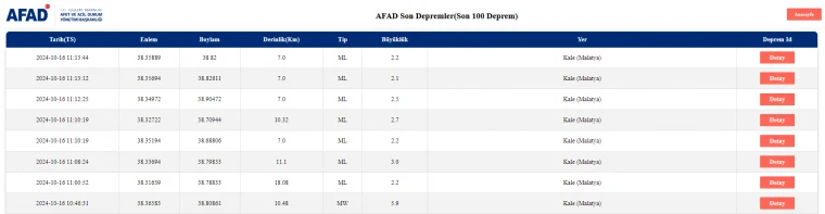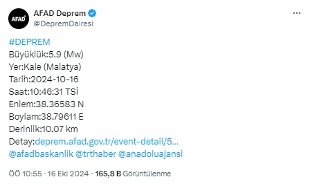 Afet ve Acil Durum Yönetimi Başkanlığı (AFAD), Malatya'nın Kale ilçesinde 5.9 büyüklüğünde bir deprem meydana geldiğini duyurdu. Deprem, 10.7 kilometre derinlikte kaydedildi ve çevre illerde de hissedildi.
