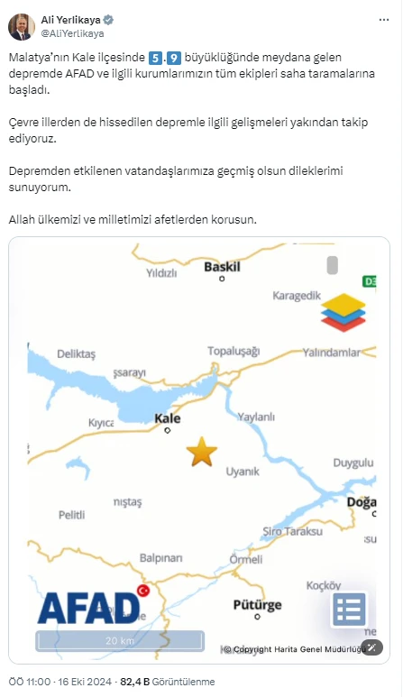 "Malatya’nın Kale ilçesinde 5.9 büyüklüğünde meydana gelen depremde AFAD ve ilgili kurumlarımızın tüm ekipleri saha taramalarına başladı. Çevre illerden de hissedilen depremle ilgili gelişmeleri yakından takip ediyoruz. Depremden etkilenen vatandaşlarımıza geçmiş olsun dileklerimi sunuyorum. Allah ülkemizi ve milletimizi afetlerden korusun."