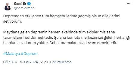 "Depremden etkilenen tüm hemşehrilerime geçmiş olsun dileklerimi iletiyorum. Meydana gelen depremin hemen akabinde tüm ekiplerimiz saha taramalarını sürdürmektedir. Şu ana kadar komuta merkezimize gelen herhangi bir olumsuz durum yoktur. Saha taramalarımız devam etmektedir."
