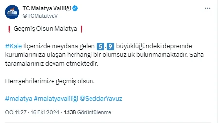 "Geçmiş Olsun Malatya. Kale ilçemizde meydana gelen 5.9 büyüklüğündeki depremde kurumlarımıza ulaşan herhangi bir olumsuzluk bulunmamaktadır. Saha taramalarımız devam etmektedir. Hemşehrilerimize geçmiş olsun.''
