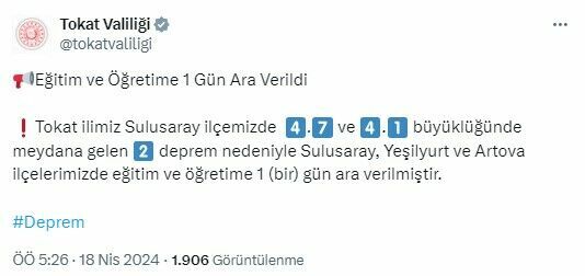 Depremin etkisiyle okullarda da tatil kararı alındı. İlçe genelinde tedbir amaçlı olarak okulların tatil edildiği duyuruldu. Bu kararın, olası artçı sarsıntılara karşı alınan bir önlem olduğu belirtildi.