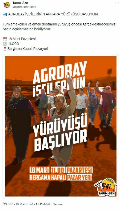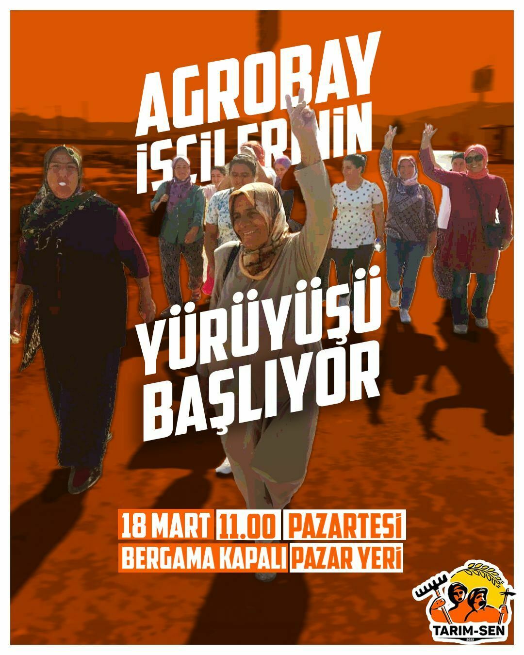 Tarım-sen sendikasının yaptığı açıklamaya göre, "AGROBAY işçileri, Ankara'da bir yürüyüş başlatıyor. Sendika yetkilileri, tüm emekçileri ve emek dostlarını yürüyüş öncesi gerçekleştirecekleri basın açıklamasına davet ediyor.
