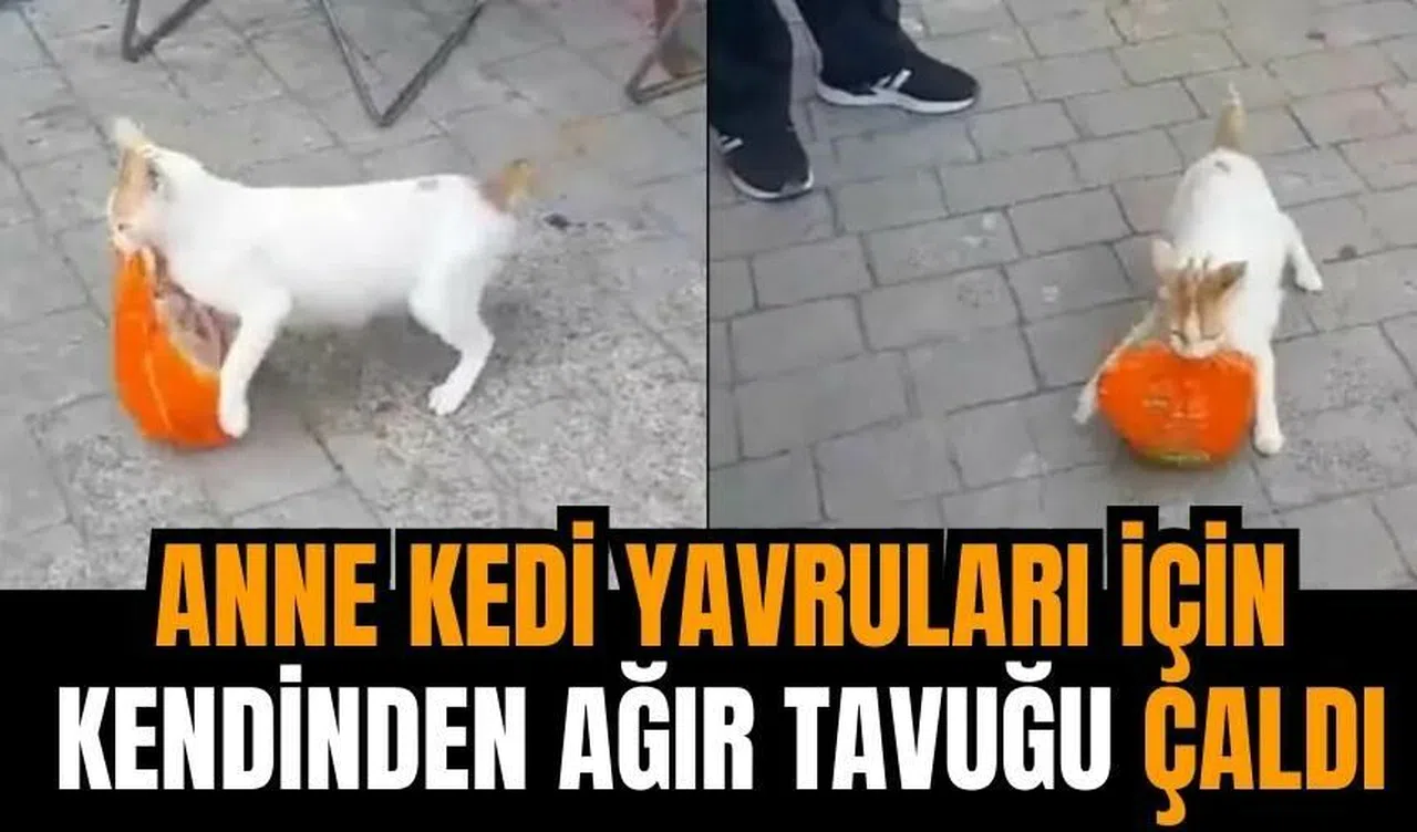 Yavruları için koca tavuğu çalan anne kedinin o anları sosyal medyada izleyenleri güldürdü. Yolun sonunda çaldığı tavuğu yavrularına götürdüğü fark edilen kedi yürek ısıttı.