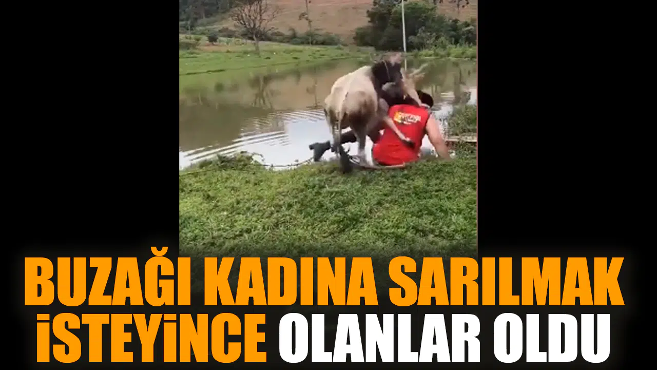 Çift, inek yavrusunun yaklaştığının farkında değildi. İnek yavrusu, kadına sarılmaya çalışınca, üçü de suya düştü. Bu eğlenceli olay, kameraya böyle yansıdı.