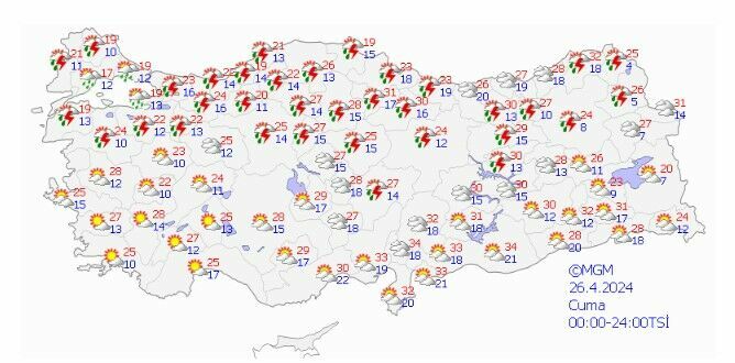 Meteoroloji Genel Müdürlüğü tarafından yapılan son değerlendirmelere göre, ülke genelinin parçalı yer yer çok bulutlu, Marmara, İç Anadolu’nun kuzeydoğusu, Batı ve Orta Karadeniz, Doğu Karadeniz’in iç kesimleri, Doğu Anadolu’nun kuzeyi, Doğu Akdeniz’in Toroslar kesimi ile Afyonkarahisar, Eskişehir ve Ankara çevrelerinin sağanak ve gök gürültülü sağanak yağışlı geçeceği tahmin ediliyor.