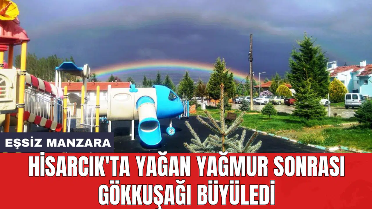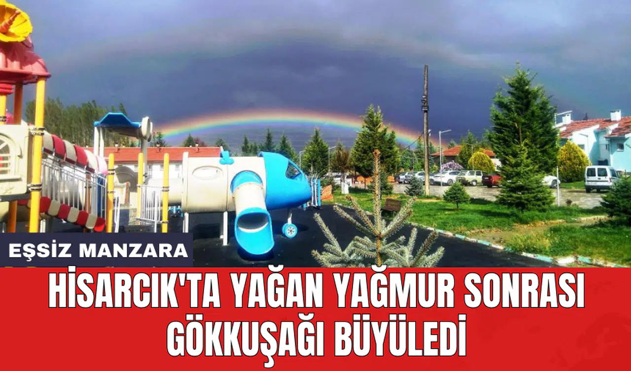 Kütahya'nın Hisarcık ilçesinde bulunan Esire Termal Turizm Merkezi'nde yaşanan olağanüstü bir doğa olayı, ziyaretçileri adeta büyüledi. Belediyeye ait turizm merkezinde hafif yağmurun ardından gökyüzünde beliren gökkuşağı, doğanın görkemli bir gösterisi olarak karşımıza çıktı.