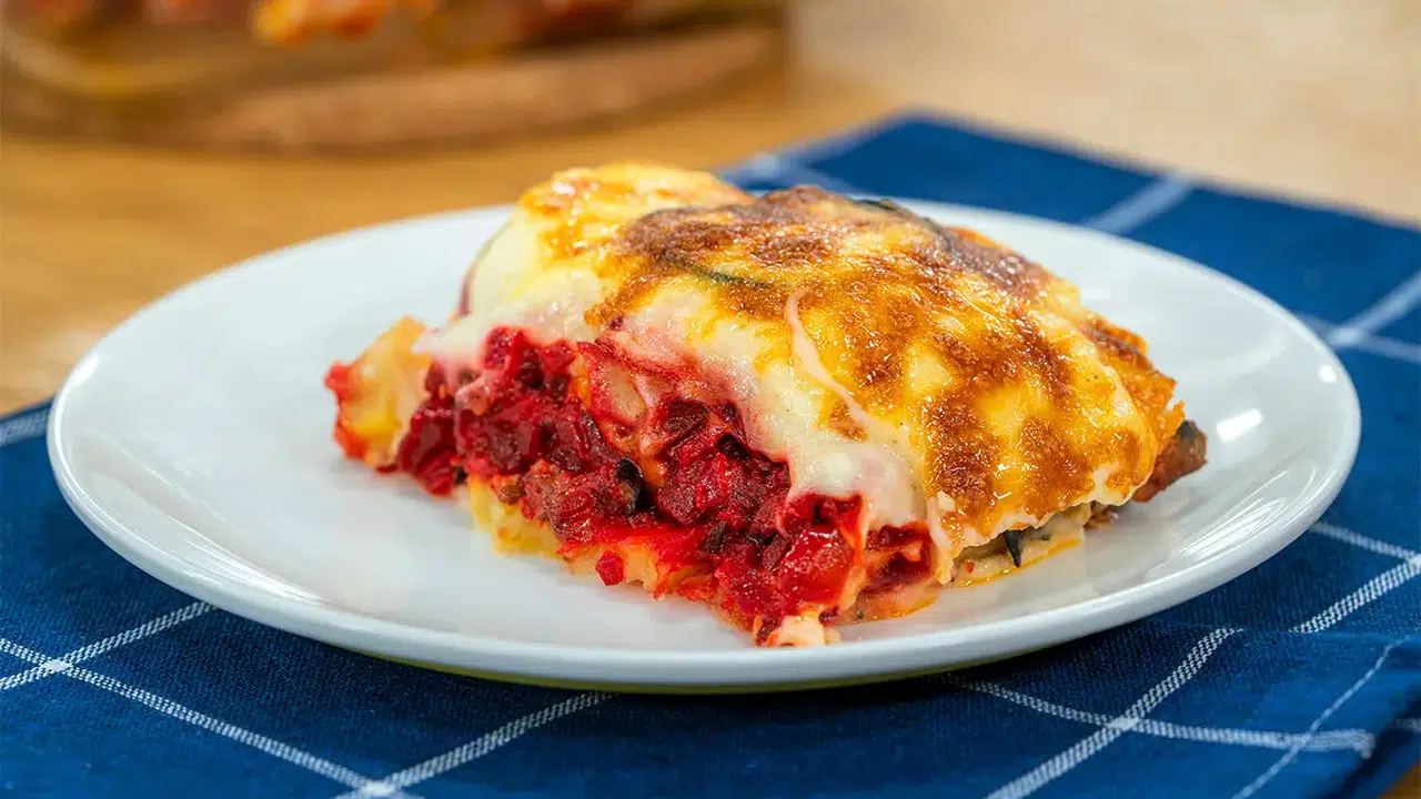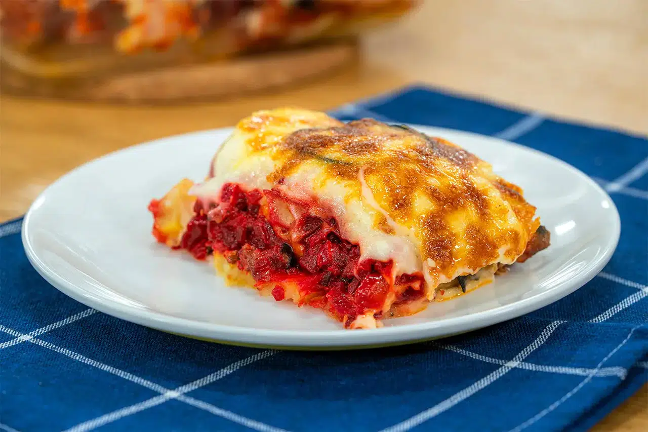 Orta boy kare bir fırın kabının tabanına az miktarda beşamel sos koyun ve yayın. Üzerine bir kat patates dizin. Patateslerin üzerine pancarlı sostan bir miktar koyun ve üzerine kızarmış patlıcan dilimlerini yerleştirin. Patlıcanların üzerine pancarlı sos ve beşamel sos ekleyin. Kalan patatesleri dizin, üstlerini kalan pancarlı sostan kaplayın ve son olarak patlıcanları ekleyin. Tüm tepsiyi beşamel sos ve rendelenmiş kaşar peyniri ile kaplayın.