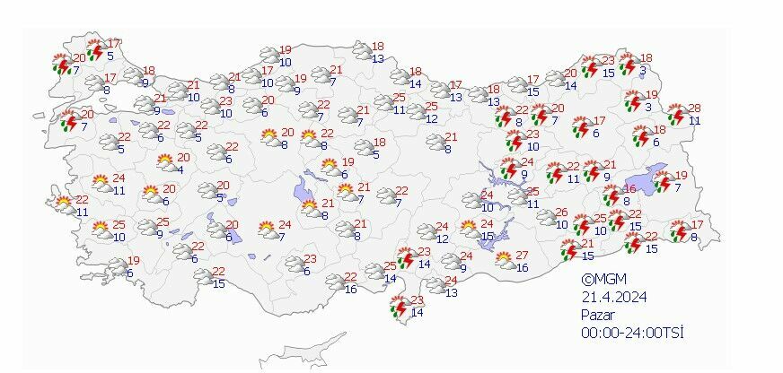 - Akdeniz: Parçalı ve az bulutlu, yerel sağanak ve gök gürültülü sağanak yağışlı.