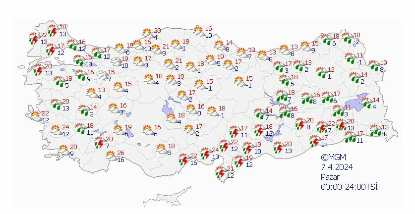 - Ege: Parçalı ve az bulutlu, iç kesimlerinde çok bulutlu olacak. Manisa, Uşak ve Denizli çevrelerinde yerel sağanak yağışlar bekleniyor.