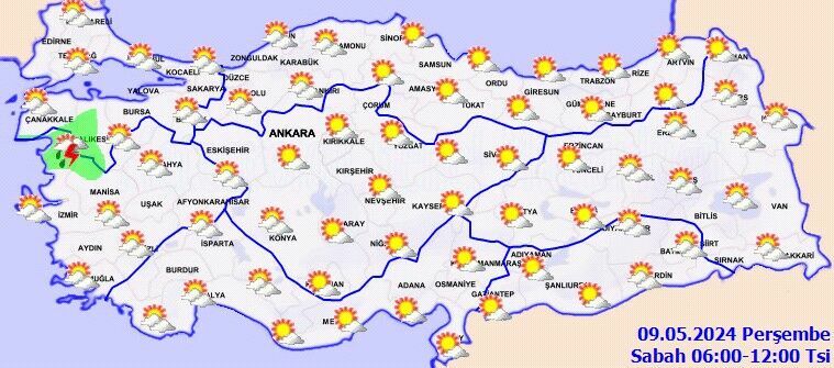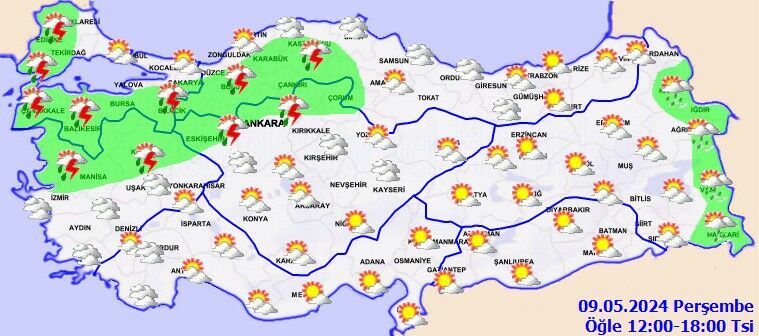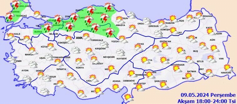 Ülkemiz genelinin parçalı ve yer yer çok bulutlu olacağı tahmin ediliyor. Marmara'nın güney ve doğusu, Batı Karadeniz ile Ankara'nın kuzey ve batısı, Edirne, Kırklareli, Manisa, Kütahya, Eskişehir, Çankırı, Çorum, Kars, Iğdır, Van ve Hakkari çevrelerinde yerel sağanak ve yer yer gök gürültülü sağanak yağışlar bekleniyor.