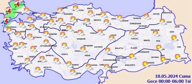 Parçalı ve yer yer çok bulutlu. Güney ve doğusu ile Edirne ve Kırklareli çevrelerinde sağanak ve gök gürültülü sağanak yağışlar bekleniyor.