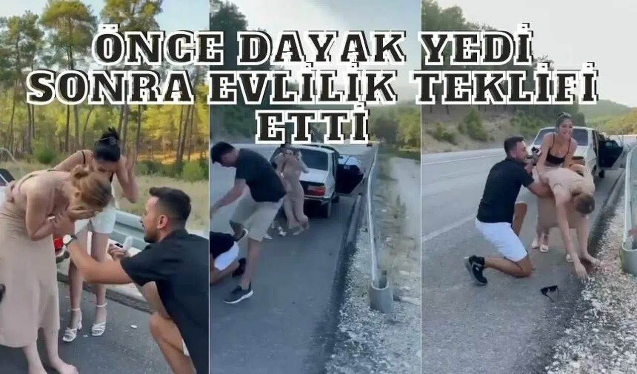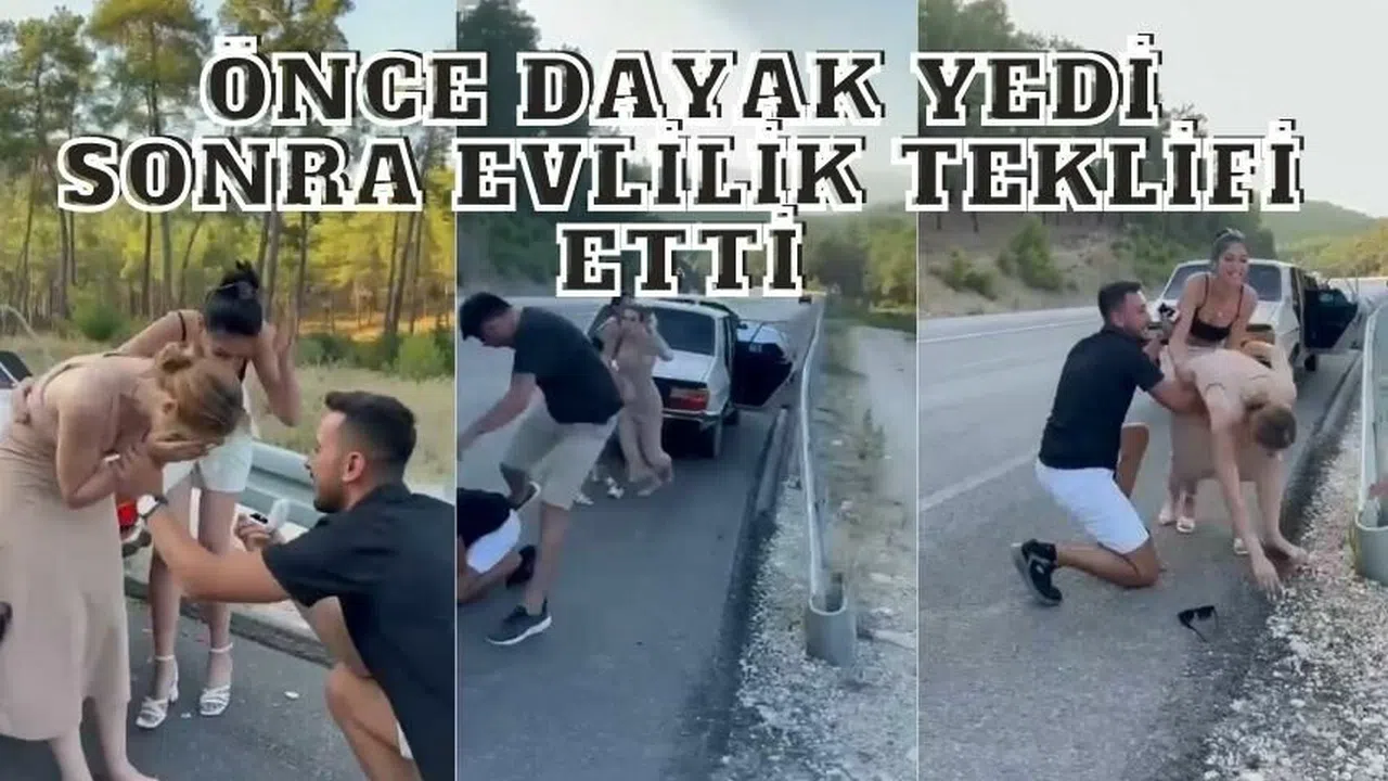 Sosyal medyada paylaşılan ve Antalya’da yaşandığı belirtilen olayda bir damat adayı, önce trafikte diğer sürücüler kavga ediyormuş gibi yaparak yerde dayak yedi. Bu sırada gencin yanında bulunan sevgilisi önce kavgayı ayırmaya çalıştı, sonra ise krize girerek büyük korku yaşadı. Genç kızın uzun süre gözyaşı döktüğü görüldü. Bir süre sonra dayak yediği yerden kalkan genç bir anda elinde yüzükle sevgilisinin karşısında diz çöktü. Konfetilerin patladığı anda şoku atlatmakta zorlanan genç kız, sevgilisinin teklifini kabul etti. O anlar cep telefonu kamerası tarafından kayda alındı.