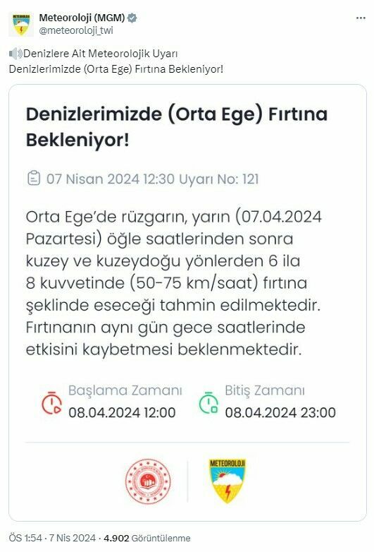 Genel Müdürlüğün sosyal medya hesapları üzerinden yapılan paylaşıma göre, fırtınanın aynı gün gece saatlerinde etkisini kaybetmesi bekleniyor. Bu durum, bölgedeki vatandaşların dikkatli olması gerektiğini vurguluyor.