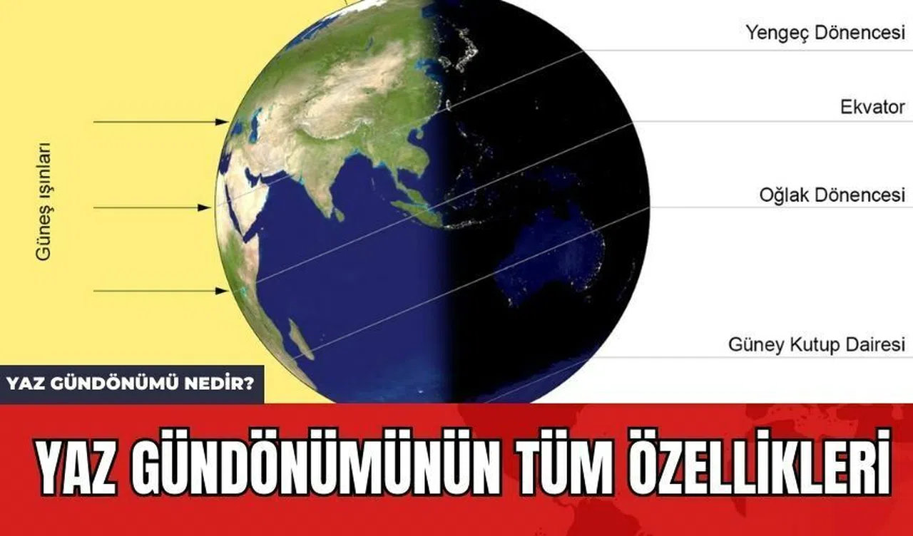 Yaz gündönümü olarak bilinen 21 Haziran'da, güneş ışınları Yengeç Dönencesi'ne 90 derece açıyla gelir. Bu nedenle, aydınlanma çemberi kutup dairelerine teğet geçer ve kuzey yarım kürede gündüzler gecelere göre daha uzun olur. Kuzey yarım kürede yaz mevsiminin başlangıcı olarak kabul edilen 21 Haziran'dan itibaren gündüzler kısalmaya, geceler ise uzamaya başlar.