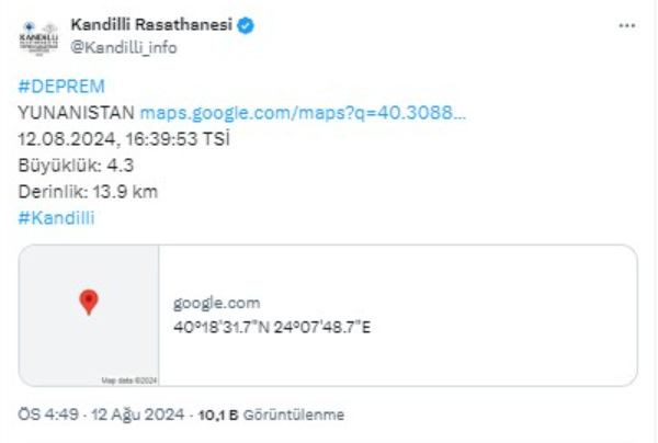 Boğaziçi Üniversitesi Kandilli Rasathanesi ve Deprem Araştırma Enstitüsü, Yunanistan'da 4.0 ve 4.3 büyüklüğünde depremler meydana geldiğini duyurdu.