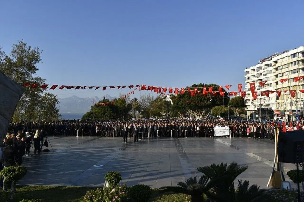 Ulu Önder Gazi Mustafa Kemal Atatürk, vefatının 84’üncü yıl dönümünde tüm yurtta düzenlenen törenlerle anıldı. Gazi Mustafa Kemal Atatürk’ün aramızdan ayrılışının 84’nci yılında, Cumhuriyet Meydanı’ndaki Atatürk Anıtı önünde saat 9’u 5 geçe Antalya’da hayat durdu. Anma programı kapsamında Cumhuriyet Meydanı’nda Atatürk Anıtı’na çelenk bırakıldı. Programa Antalya Valisi Ersin Yazıcı, Antalya Büyükşehir Belediye Başkanı Muhittin Böcek ve kent protokolü ile siyasi partilerin temsilcileri, çok sayıda kamu kurumu yöneticisi ve vatandaşlar katıldı. Saatler 09.05’i gösterdiğinde, Atatürk’ün manevi huzurunda 2 dakikalık saygı duruşu yapıldı. Resmi törenin ardından çok sayıda meslek kuruluşu, siyasi siyasi partiler, sendikalar ve sivil toplum örgütü temsilcileri de Atatürk Anıtı’na çelenk bıraktı.
