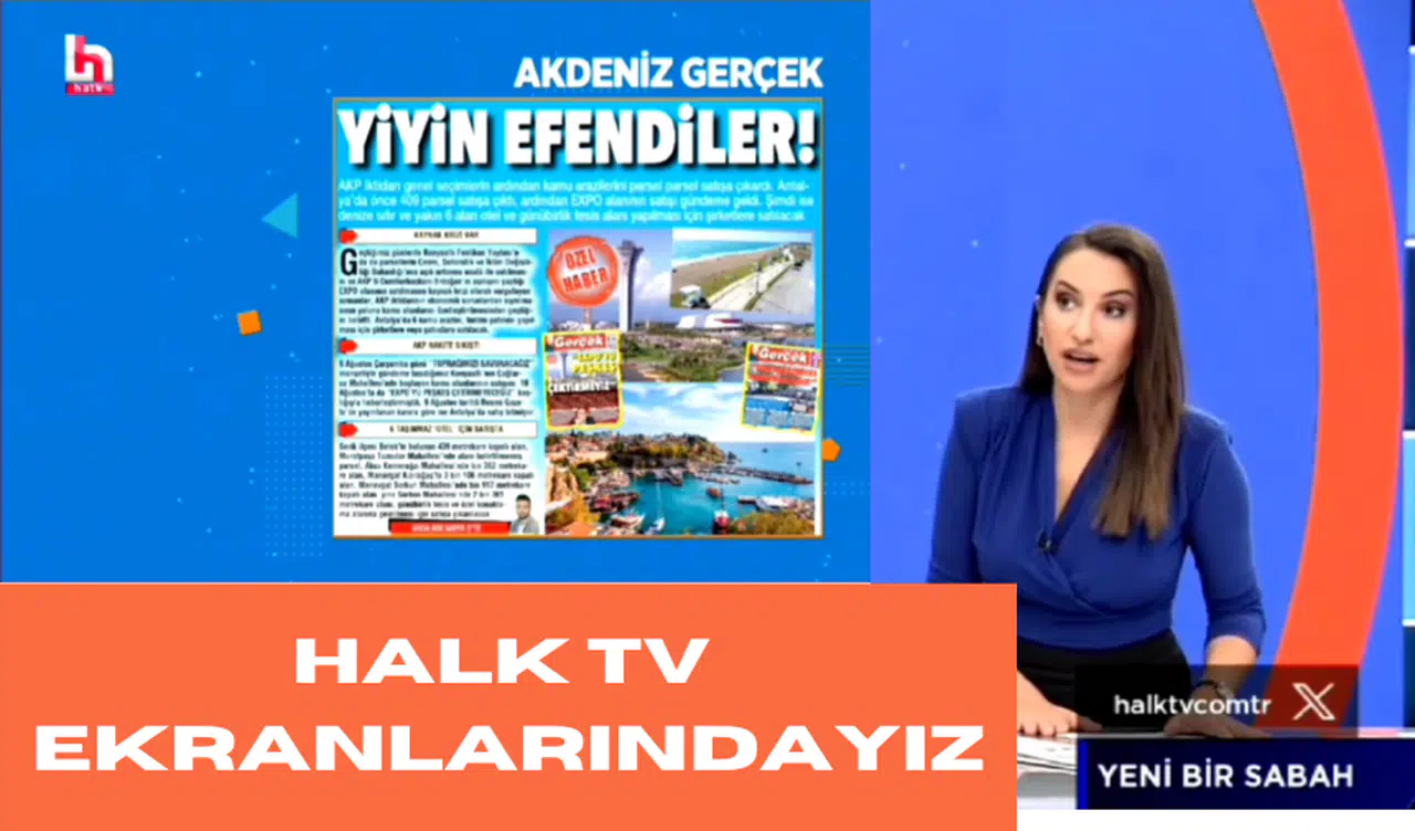 SÜLEYMAN GEZİCİ / "AKP iktidarı genel seçimlerin ardından kamu arazilerini parsel aprsel satışa çıkardı. Antalya'da önce 409 parsel satışa çıktı, ardından EXPO alanının satışı gğndeme gelsi. Şimdi ise denize sıfır ve yakın 6 otel ve günü birlik tesis alanı yapılması için şirketelere satışa çıkarılacak" konulu haberimiz, Halk TV ekranlarında Yeni Bir Sabah programında, gazeteci, televizyon haber programı sunucusu Gözde Şeker ile tekrardan yorumlandı.