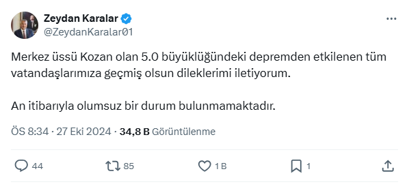 “Merkez üssü Kozan olan 5.0 büyüklüğündeki depremden etkilenen tüm vatandaşlarımıza geçmiş olsun dileklerimi iletiyorum. An itibarıyla olumsuz bir durum bulunmamaktadır” mesajlarına yer verdi.