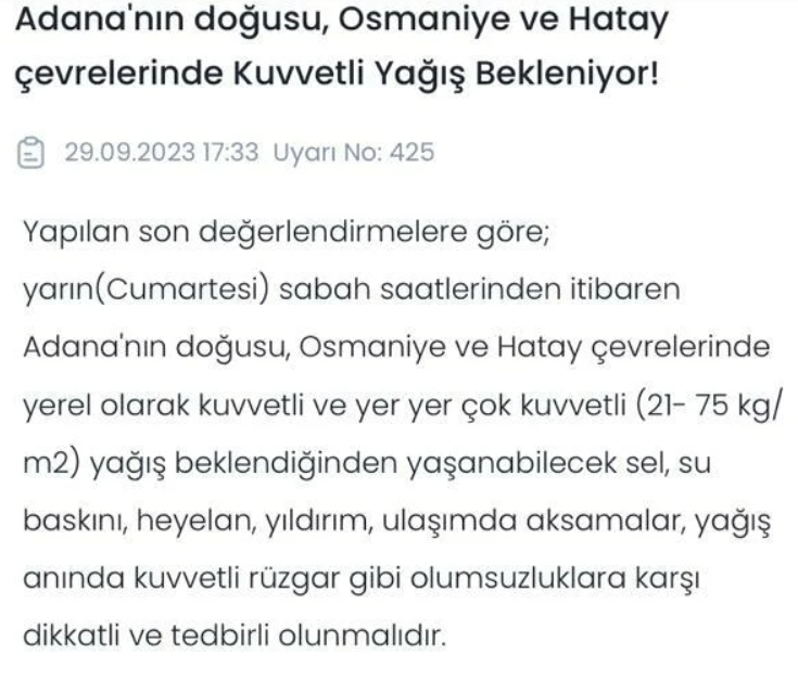"Yapılan son değerlendirmelere göre; yarın(Cumartesi) sabah saatlerinden itibaren Adana'nın doğusu, Osmaniye ve Hatay çevrelerinde yerel olarak kuvvetli ve yer yer çok kuvvetli (21-75 kg/ m2) yağış beklendiğinden yaşanabilecek sel, su baskını, heyelan, yıldırım, ulaşımda aksamalar, yağış anında kuvvetli rüzgar gibi olumsuzluklara karşı dikkatli ve tedbirli olunmalıdır."