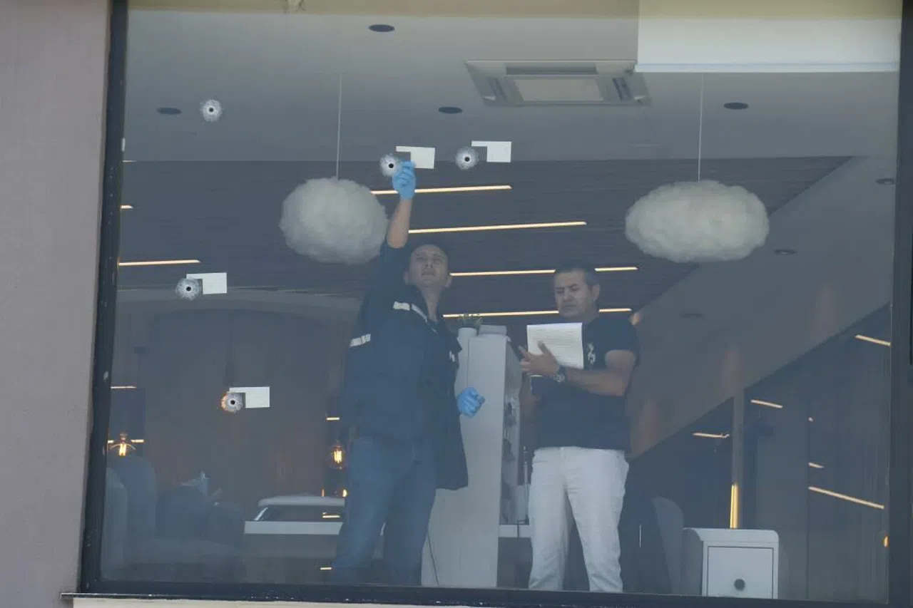 Motosiklet ile gelen şüpheliler, tabancayla yaklaşık 30 el ateş ederken, iş yerine 15 tane kurşun isabet etti.
