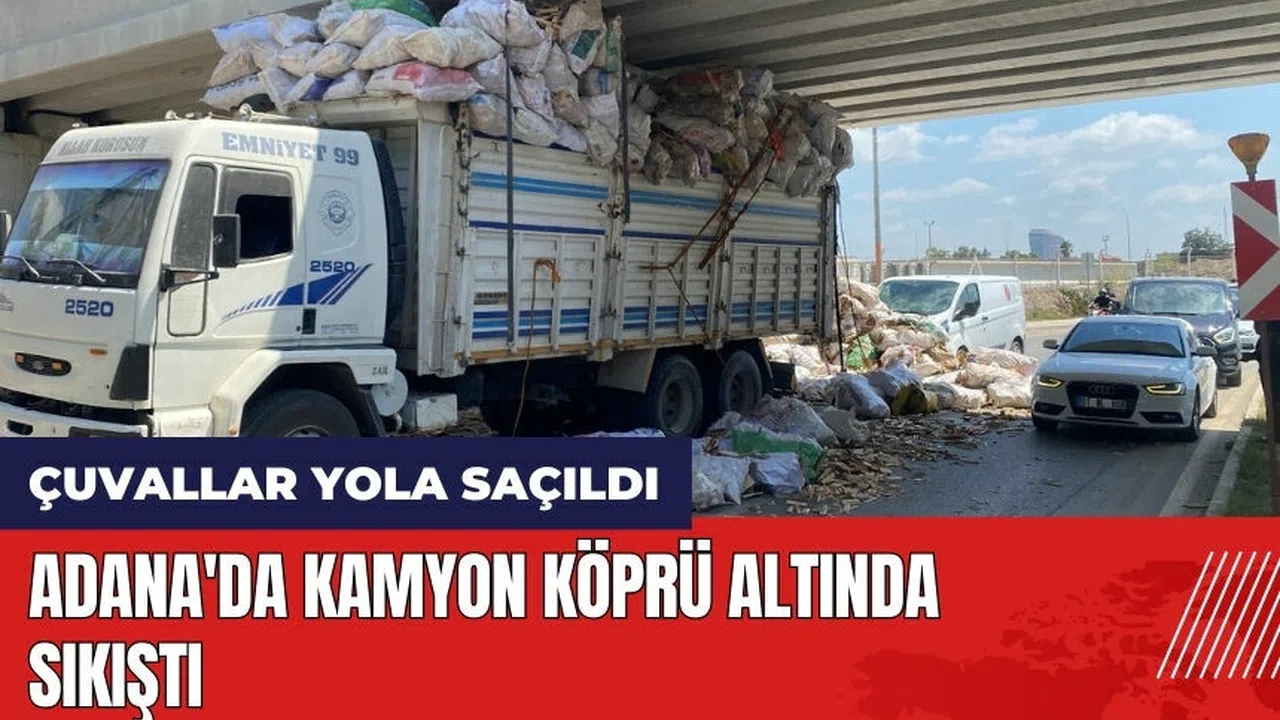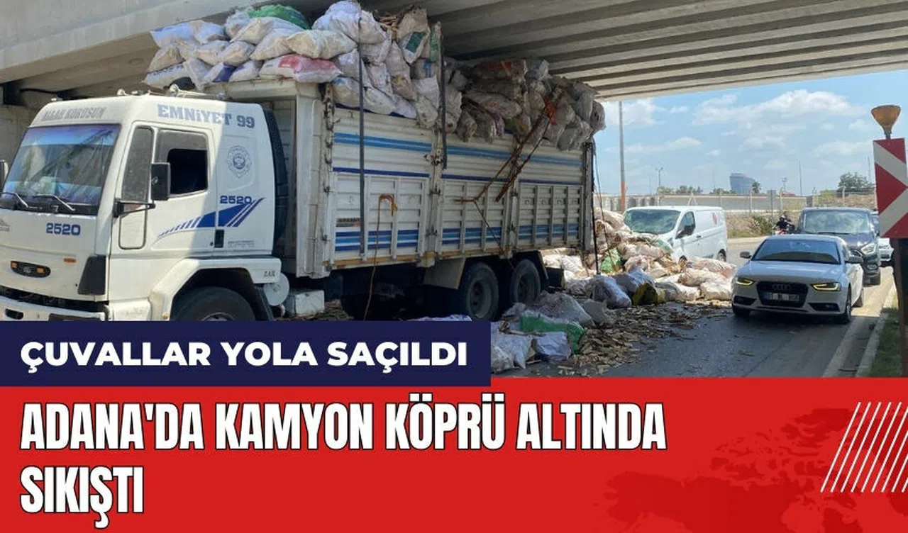 Adana'nın Seyhan ilçesine bağlı Reşatbey Mahallesi'nde Fuzuli Caddesi üzerinde meydana gelen olayda, seyir halindeki bir kamyon, köprü altında sıkıştı. 4 metre yüksekliğindeki köprüye sıkışan kamyonda bulunan onlarca çuval, yola saçıldı.