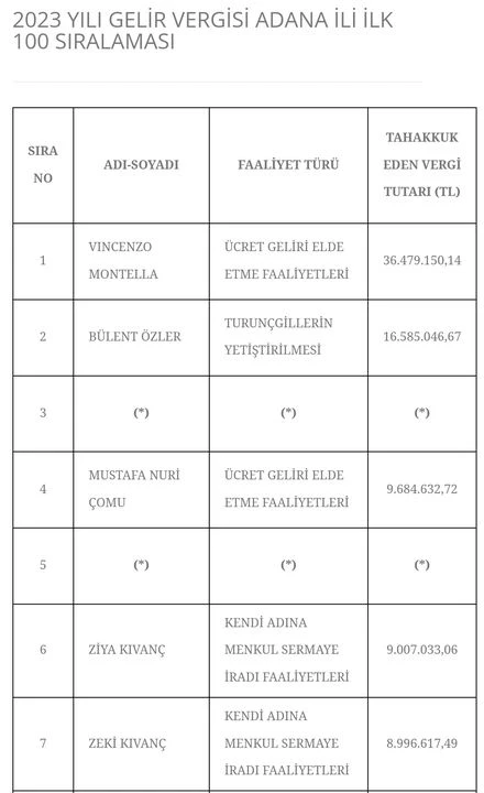 Listenin ikinci sırasında ise 16 milyon 585 bin 46 liralık gelir vergisi beyanıyla turunçgil üreticisi Bülent Özler yer aldı. Adana’daki vergi rekortmenleri listesinde zirvede yer alan bu iki ismin yanı sıra, farklı meslek gruplarından birçok kişi de dikkat çekti.