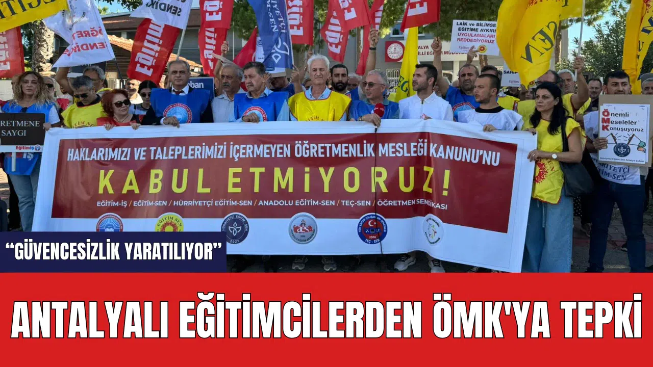 Eğitim-İş Antalya Şubesi, Eğitim-Sen Antalya Şubesi, Hürriyetçi Eğitim-Sen Antalya Şubesi, Anadolu Eğitim-Sen Antalya Şubesi, Teç-Sen Antalya Şubesi ve Öğretmen Sendikası eğitimde artan sorunlar ve eğitimcilerin yaşadığı problemleri Antalya İl Milli Eğitim Müdürlüğü önünde dile getirdi. Eğitim-İş Antalya Şube Başkanı Sadık Acar, “Eğitimin ana bileşenlerinden birisi olan eğitim ve bilim emekçilerini yok sayan, taleplerine ısrarla kulak tıkayan MEB, sürecin başından bu yana bildiğini okumaya devam etmeyi sürdürmektedir. Eğitim sendikalarının, halen görevde olan ve atama bekleyen bir milyonu aşkın öğretmenin taleplerini yok sayan ÖMK’ye yönelik eleştiri ve önerilerimizin ısrarla görmezden gelinmesi bizler açısından kabul edilemez bir durumdur. Öğretmenlik mesleğini itibarsızlaştıran ve emeğimizi değersizleştiren, ekonomik, sosyal ve mesleki sorunlarımıza çözüm üretmeyen, eşit işe eşit ücret ilkesini ortadan kaldıran, özlük haklarımızı zayıflatan, çalışanlar arasında ayrımcılığı ve eşitsizliği derinleştiren bir içeriğe sahip olan ÖMK’ya karşıyız” dedi.