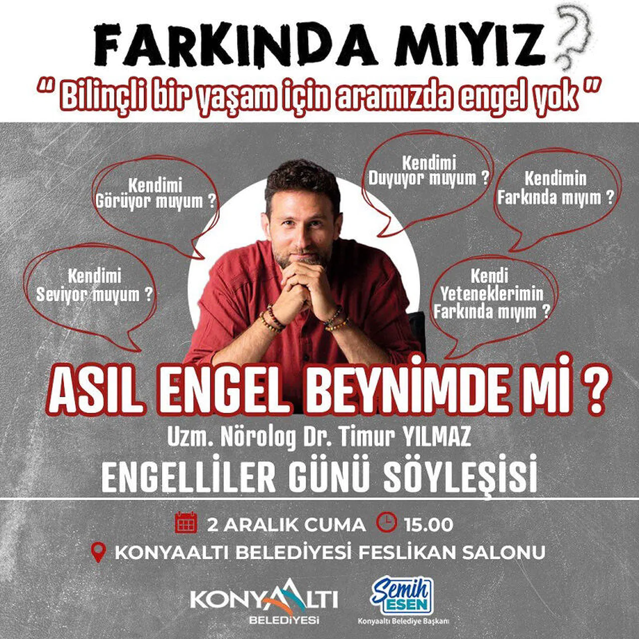 Konyaaltı Belediyesi, “Dünya Engelliler Günü’’ kapsamında Uzman Nörolog Dr. Timur Yılmaz’ın konuşmacı olarak katılacağı bir söyleşi gerçekleştirecek.