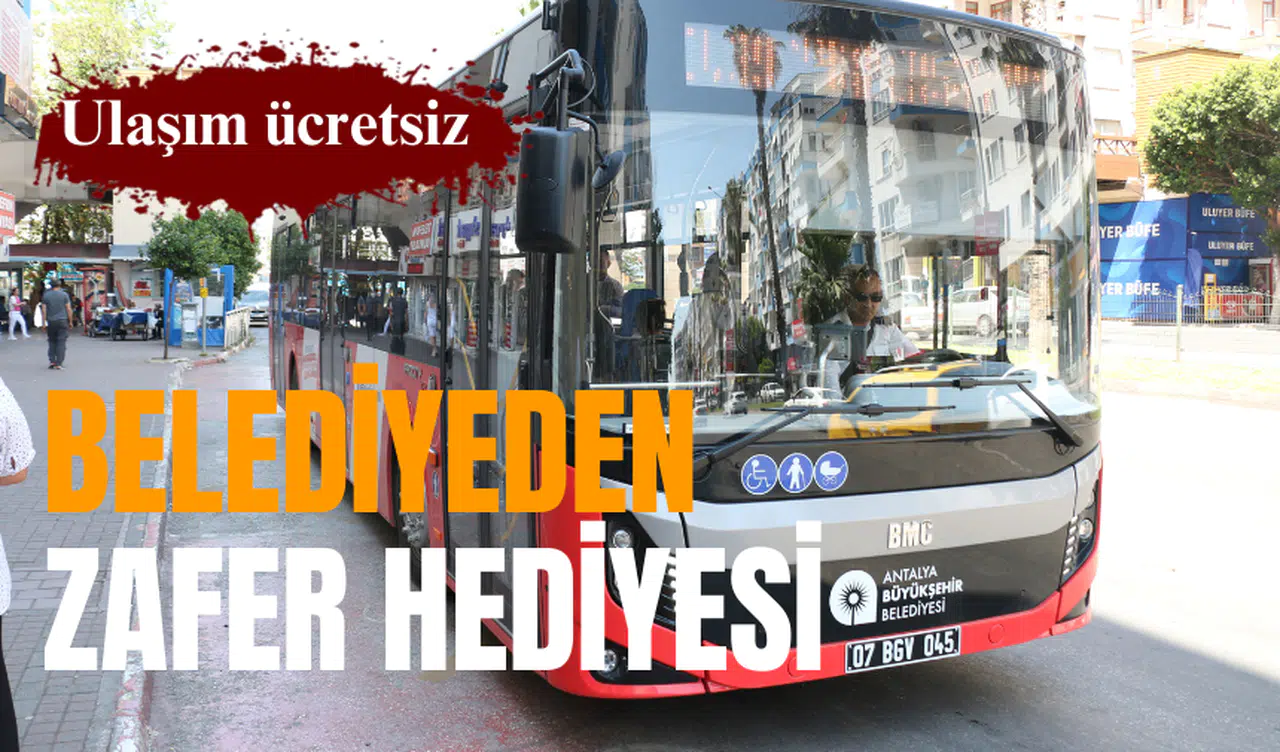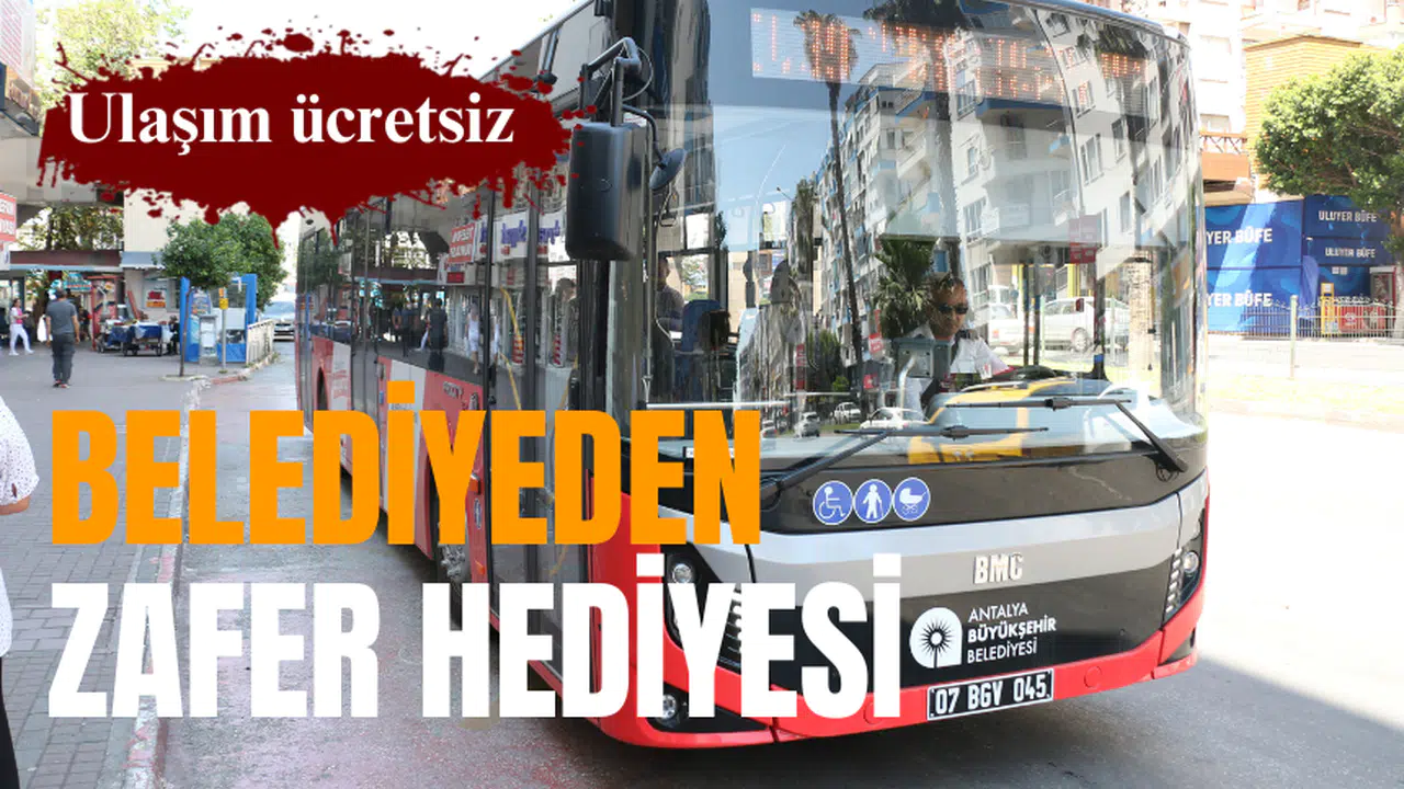 Antalya Büyükşehir Belediyesi, 30 Ağustos Zafer Bayramı'nda belediyeye ait resmi plakalı otobüsleri ve raylı sistem araçlarının ücretsiz yolcu taşıyacağını duyurdu. Antalya Büyükşehir Belediyesi, 30 Ağustos Zafer Bayramı’nda belediyeye ait toplu ulaşım araçlarının ücretsiz yolcu taşıması kararı aldı. 30 Ağustos Çarşamba günü belediyenin resmi plakalı otobüsleri, ANTRAY ve nostalji tramvayı vatandaşların kutlamalara rahat ulaşım sağlamaları ve Zafer Bayramı’nı coşkuyla kutlamaları için ücretsiz olacak.