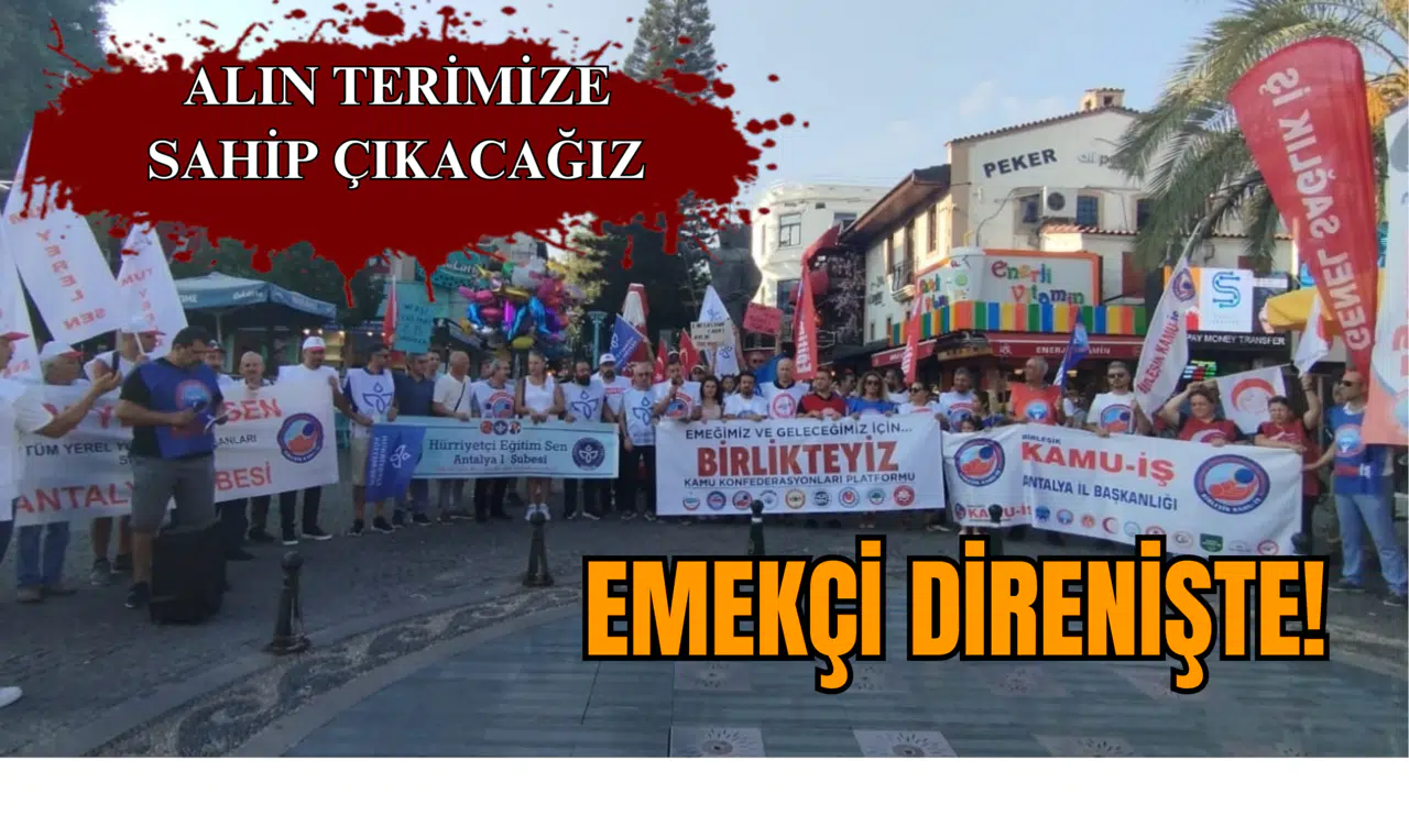 Teç-Sen Antalya İl Temsilcisi Murat Soydinç, “Memurlara, yılda bir defa yıllık izne ayrılırken bir maaş tutarında yıllık izin ikramiyesi ödenmelidir. Tüm kamu çalışanlarına her yıl iki defa birer net maaş tutarında bayram ikramiyesi ödenmelidir. Aile yardımı enflasyon oranları dikkate alınarak birinci çocuk için 3.000 lira, ikinci çocuk için 4 bin lira ve üçüncü çocuk için 6 bin liraya çıkarılmalıdır. Ölüm yardımı ödeneği en düşük memur maaşı seviyesine çıkarılmalıdır. Kamu çalışanlarına ya kreş olanağı sağlanmalı ya da günün koşullarına uygun olarak kreş yardımı verilmelidir. Kamuda eşit işe eşit ücret ödenmelidir. Kamuda mülakat kaldırılmalıdır. Kamuda sözleşmeli çalışan sonlandırılmalı tamamı kadroya geçirilmelidir. Sendikaya üyelik ve çekilme işçilerde olduğu gibi e-devlet üzerinden yapılmalıdır. Yardımcı hizmetler sınıfı kaldırılmalıdır. Devlet memurlarına yiyecek, kıyafet ve ulaşım yardımı yapılmalıdır. Kamu çalışanlarının aile birlikteliği için aynı yerde görev yapmaları sağlamalıdır. Bu bilinç ve kararlılıkla; emeğin onurundan yana taraf olan kamu konfederasyonları olarak gücümüzü ve aklımızı birleştirerek kamu emekçisine sefaleti reva görenlere, bizi ve haklarımızı görmezden gelenlere karşı Bugün üretimden gelen gücümüzü kullanarak uyarı amacıyla ülke genelinde 1 günlük iş bırakıyoruz. Memurun ve memur emeklisinin alın terini kimseye heba ettirmeyeceğiz” diyerek açıklamasını tamamladı.
