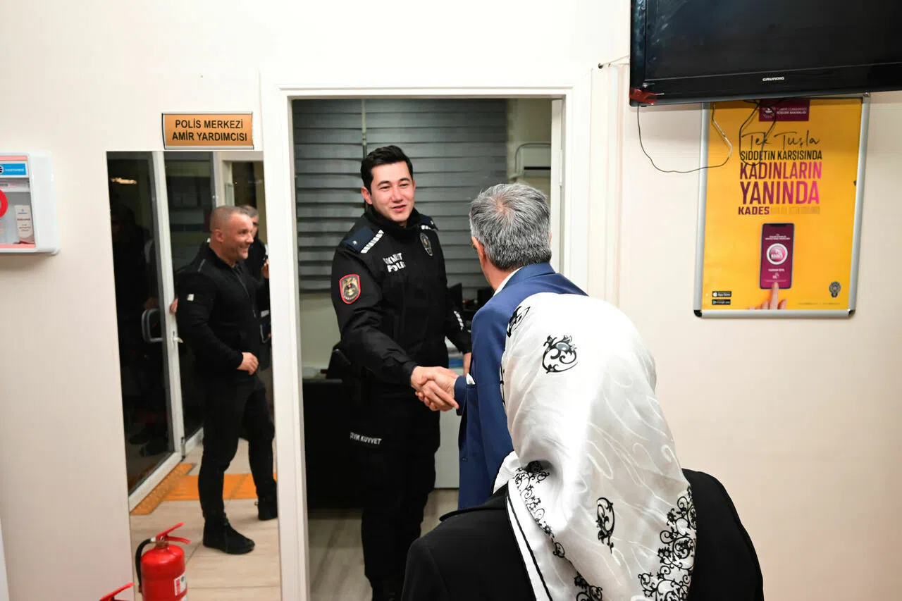 Başkan Topaloğlu ve eşi Fikriye Topaloğlu, hastane ziyaretleri sonrasında yılbaşında huzur ve güveni sağlamak için gecesini gündüzüne katan polis ekiplerini de unutmadı. Liman Caddesi’ndeki Kemer Emniyet Müdürlüğü Polis Karakolu’ndaki polisleri de ziyaret eden Başkan Topaloğlu ve eşi Fikriye Topaloğlu, kolluk kuvvetlerine baklava ikram etti.