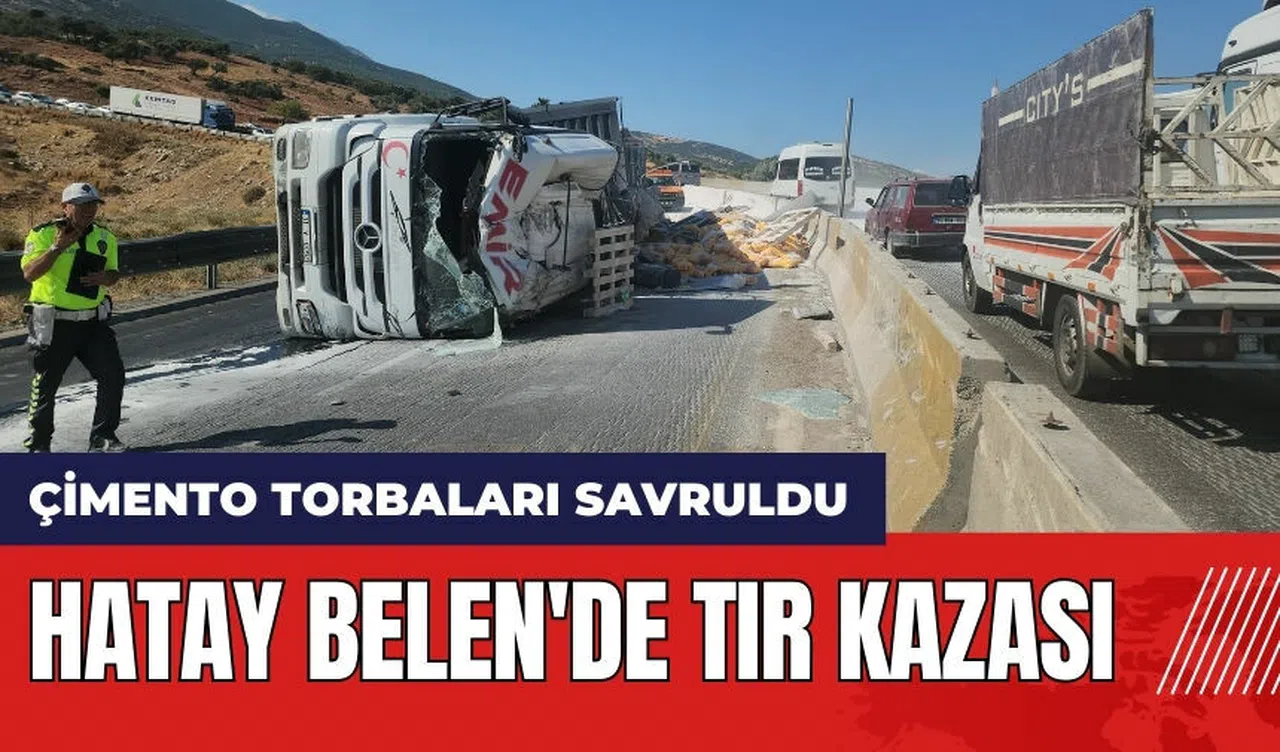 Hatay'ın Belen ilçesi Kıçı mevkiinde, sürücüsünün direksiyon hakimiyetini kaybettiği Mercedes marka 31 V 8053 plakalı çimento torbası yüklü tır yola devrildi. Kazanın ardından, tırın yükündeki onlarca çuval yola savruldu.