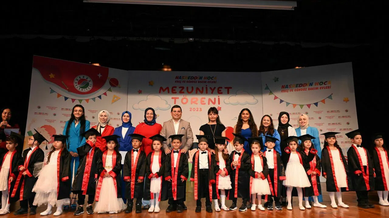 Kepez Belediyesi’nden alınan bilgiye göre Antalya’nın en çok talep gören Nasreddin Hoca Kreş ve Gündüz Bakım Evleri, 2022-2023 yılı eğitim ve öğretim dönemini tamamlayan öğrenciler için mezuniyet töreni düzenledi. Yoğunluk nedeniyle Ahatlı, Erenköy, Sakarya ve Özgürlük şubelerinin mezuniyet töreni farklı gün ve saatlerde Erdem Bayazıt Kültür Merkezi’nde gerçekleştirildi. Kepez Belediye Başkanı Hakan Tütüncü’de törene katılarak çocukların ve ailelerinin bu mutlu gününe ortak oldu. Nasreddin Hoca Kreş ve Gündüz Bakım Evlerinin 2023 mezuniyet töreninde konuşan Kepez Belediye Başkanı Hakan Tütüncü, bugünün sevinç ve iftihar günü olduğunu söyledi.