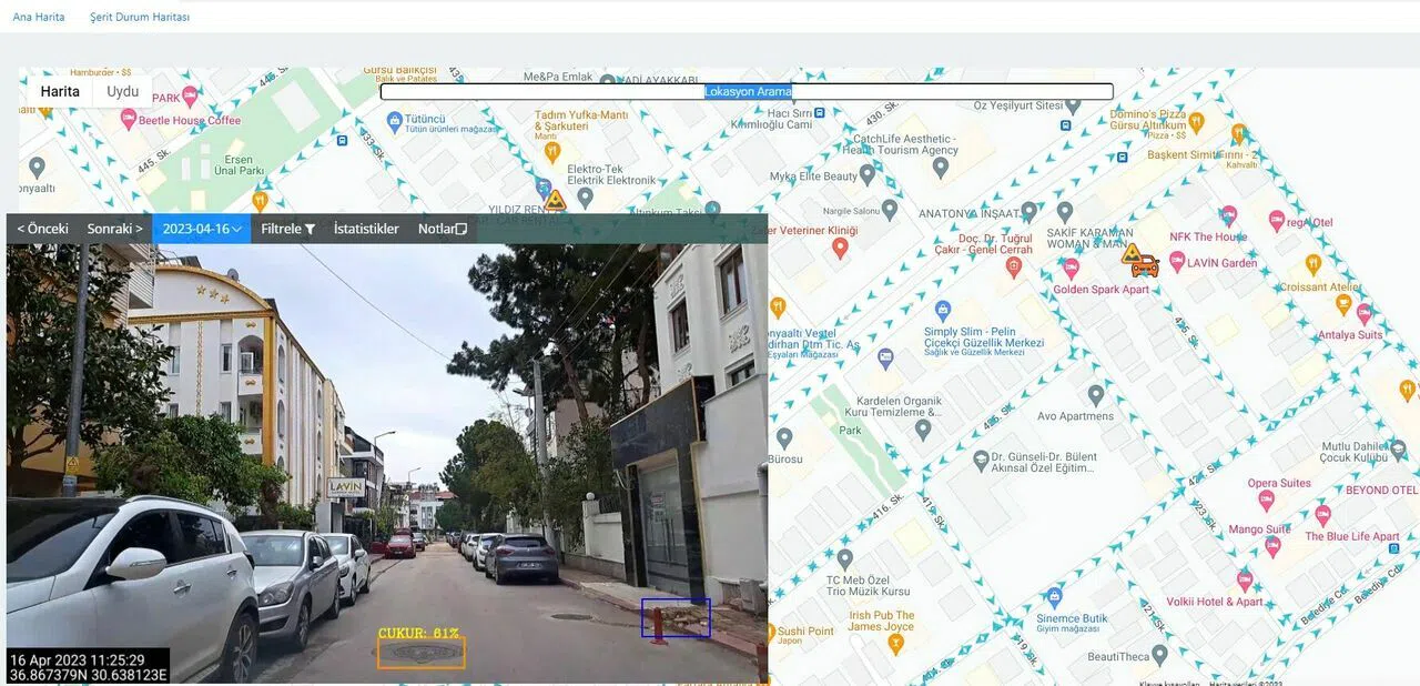 “Yani bu ne demek. Bir sokağa girdiğinizde o sokağın neresinde rögar var, neresinde kaldırım taşı bozuk, neresinde çukur ve tümsek var gibi bilgileri elde edebiliyoruz. Aynı zamanda yol güzergâhı boyunca trafik levhası ve trafik ışıklarının verilerini de yapay zekâ ile koordinatlı olarak topluyoruz. Yapay zekâ trafik levhasının olmadığı yerlerde trafik lambası ihtiyacını da belirliyor. Örneğin sola dönen bir yol var ve sola dönmenin serbest olduğuna dair bir trafik levhası yoksa yapay zekâ bunu da belirliyor. Çukurun yüzde kaç oranında olduğunu bile görebiliyorsunuz bu sistemle. Kırsal bölge ile ilgili sorunlarımız olduğunda da kırsal bölgedeki çukurlarımızı, yamalarımızı ada, parsel, sokak numarası ile görebiliyoruz. Onarım çalışması yapıldıktan sonra bölgenin fotoğrafı çekilip sisteme yüklendiğinde harita üzerindeki ünlem işareti kalkıyor.”