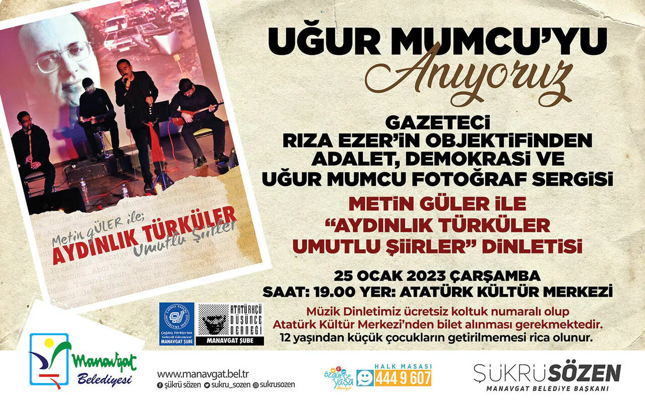 Adalet ve Demokrasi Haftası nedeniyle Atatürk Kültür Merkezi’nde oluşturulan fotoğraflı anma koridorunda, hafta boyunca katledilerek öldürülen aydınlar, Uğur Mumcu, Abdi İpekçi, Ahmet Taner Kışlalı, Bahriye Üçok Çetin Emeç, Gaffar Okkan, Hrant Dink, Muammer Aksoy, Metin Göktepe, Necip Hablemitoğlu fotoğrafları önünde yanan mumlar ve karanfillerle anılacak. Atatürk Kültür Merkezi’nde 25 Ocak 2023 Çarşamba günü saat 19.00’daki anma etkinlikleri kapsamında 24 Ocak 1993’te katledilen gazeteci ve yazar Uğur Mumcu’nun Cumhuriyet Gazetesi’nden çalışma arkadaşı olan “Gazeteci Rıza Ezer’in Objektifinden Adalet-Demokrasi ve Uğur Mumcu Fotoğrafları” sergisinin açılışı yapılacak. Emekli Gazeteci Rıza Ezer ve Belediye Başkanı Şükrü Sözen’in katılımıyla açılacak olan fotoğraf sergisinde, Uğur Mumcu’nun gazetecilik yıllarındaki fotoğrafları ve o yıllarda adalet ve demokrasiye bakış açısını yansıtan fotoğraflar yer alacak. Etkinlikler kapsamında ardından sanatçı Metin Güler’in “Aydınlık Türküler-Umutlu Şiirler” dinletisinde özgürlük şarkıları söylenecek. Manavgat Belediye Başkanı Şükrü Sözen, adalet ve demokrasiye en çok ihtiyacın olduğu bir dönemde tüm Manavgat halkını anma etkinliklerine katılmaya davet etti. Sözen, “Cumhuriyet’imize ve kazanımlarına canı pahasına sahip çıkan ancak bunun için katledilen tüm demokrasi şehitlerimize Allah’tan rahmet diliyorum. Adalet ve Demokrasiye her an hepimizin ihtiyacı var. Adalet ve Demokrasi haftasında bu farkındalığı artırmak amacıyla etkinlikler düzenledik. Tüm halkımızı sergi ve dinletimize davet ediyorum” dedi.