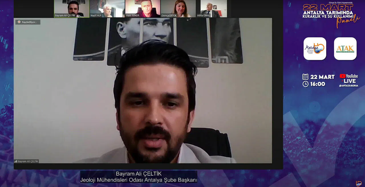 Çevrimiçi yapılan panelin moderatörlüğünü ATAK Genel Sekreteri Gonca Ertok yaptı. Panele, Ziraat Odası Başkanı Nazif Alp, Jeoloji Mühendisleri Odası Antalya Şube Başkanı Bayram Ali Çeltik, Antalya Büyükşehir Belediye Başkanlığı Tarımsal Hizmetler Daire Başkanlığı Tarımsal Yapılar ve Sulama Şube Müdürlüğü’nden Atila Ünal, DSİ 131. Şube Bölge Müdürlüğü’nden Baş Mühendis Özcan Kayacan, Yeşil Yayla Sulama Kooperatifi Başkanı Halil Toker katıldı.
