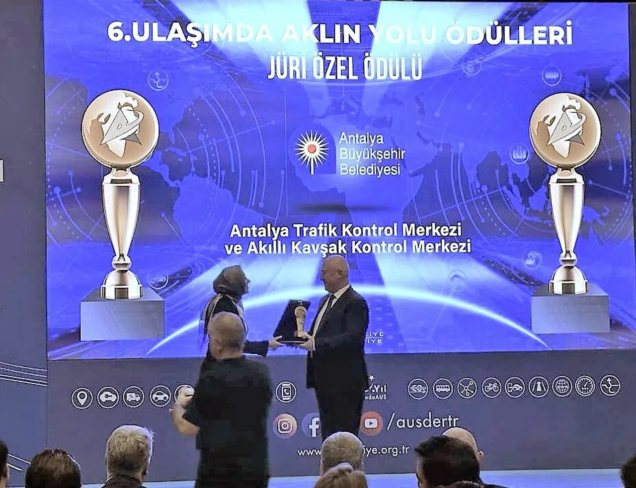 Antalya Büyükşehir Belediyesi'nden alınan bilgiye göre, ulaşım ile teknolojiyi bir araya getiren Antalya Büyükşehir Belediyesi, akıllı ulaşım uygulamalarıyla kente hizmet etmeye devam ediyor. Bu kapsamda Ulaştırma Bakanlığı Türkiye Akıllı Ulaşım Sistemleri Derneği "Ulaşımda Aklın Yolu Ödülleri" yarışmasına başvuran Antalya Büyükşehir Belediyesi, 'Antalya Trafik Kontrol Merkezi ve Akıllı Kavşak Kontrol Merkezi' projesiyle jüri özel ödülünü almaya hak kazandı. Ankara’da düzenlenen törende ödülü Antalya Büyükşehir Belediyesi Ulaşım Raylı Sistem Dairesi Başkanı Nurettin Tonguç aldı.