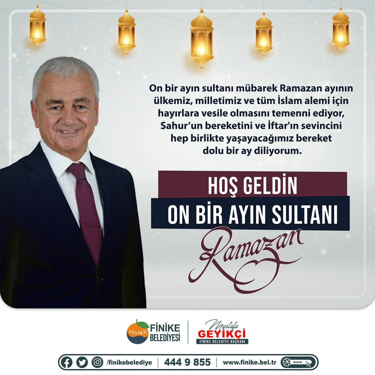 On bir ayın sultanı Ramazan ayına erişmenin mutluluğunu yaşadıklarını belirten Finike Belediye Başkanı Mustafa Geyikçi, “Kıymetli hemşehrilerim, bu mübarek ay bizleri birbirimize bağlayan, dostluk, kardeşlik, huzur ve maneviyat duygularının en yoğun yaşandığı, tüm insanlığın ortak sofralarda bir araya geldiği ve dayanışmanın sağlandığı kutsal bir aydır. Ülkemizi etkisi altına alan sel ve deprem gibi doğal afetler neticesinde, içinde bulunduğumuz acı dolu şu dönemlerde Ramazan ayının gelmesiyle birlik ve beraberlik duyguları daha da artacak ve bizler de başta iftar sofralarımız olmak üzere belediyemizin tüm imkanları ve hayırsever vatandaşlarımızın destekleriyle, ihtiyaç sahibi hemşehrilerimiz ve ilçemize yerleşen depremzede kardeşlerimizin yanında olmaya devam edeceğiz. Acılı günlerimizi el ele, birlik ve beraberlik içerisinde atlatacağız. Bu duygu ve düşüncelerle, Ramazan ayının ülkemize barış, huzur, kardeşlik ve bereket getirmesini diliyorum.” dedi.